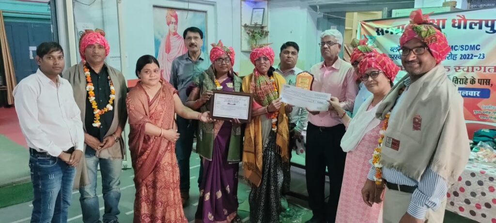 धौलपुर। राजकीय सीनियर माध्यमिक विद्यालय महाराना धौलपुर में धौलपुर का ब्लॉक स्तरीय श्रेष्ठ एसएमडी एसएमसी स्कूल के अध्यक्ष व सचिवों का सम्मान समारोह का आयोजन एडीपीसी मुकेश कुमार गर्ग के मुख्य आतिथ्य एवं ब्लॉक शिक्षा अधिकारी दामोदर लाल मीणा की अध्यक्षता में किया गया।कार्यक्रम के विशिष्ट अतिथि के रूप में एसीबीईओ सविता सिंह,एपीसी बबिता पराशर एवं कार्यक्रम अधिकारी शिवराम सेन रहे। ब्लॉक की श्रेष्ठ एसएमसी एसएमडी 6 अध्यक्षों व सचिवों को शील्ड व प्रमाण पत्र भेंट किए। मुख्य अतिथि एडीपीसी समग्र शिक्षा मुकेश कुमार गर्ग ने कहा कि बुनियादी ढांचे और शैक्षिक सुधारों को मजबूत करने के लिए विद्यालय स्तर पर गठित एसएमसी एसडीएमसी समितियो का अहम रोल होता है। विद्यालय के विकास में महत्वपूर्ण भूमिका होती है। ब्लॉक शिक्षा अधिकारी दामोदर लाल मीणा ने कहा कि सरकार ने स्कूलों मे गठित एसएमसी और एसडीएमसी समितियों को मजबूत करने की पहल की है। जिससे समिति के सदस्यों का विद्यालय से जुड़ाव बना रहे। उन्होंने सभी सदस्यों, अध्यक्ष व सचिवों को बधाई व शुभकामनाएं देकर उत्साह बढ़ाया। विशिष्ट अतिथि एसीबीईओ सविता सिंह एवं एपीसी बबिता पराशर ने कहा कि कार्यक्रम का उद्देश्य सरकारी विद्यालय के प्रति समुदाय के मन में एक सकारात्मक भावना एवं आश्वस्ति उत्पन्न करना है। इस अवसर पर श्रेष्ठ एसएमसी व एसडीएमसी के अध्यक्षों व सचिवों को सील्ड ,प्रशस्ति पत्र एवं फूल माला एवं साफा पहनाकर स्वागत सम्मान किया गया एवं 11 हजार रुपये की राशि का चैक भेंट किया। कार्यक्रम अधिकारी शिवराम सेन,कार्यवाहक प्रधानाचार्य रतन सिंह लोधा का भी सम्मान किया गया।