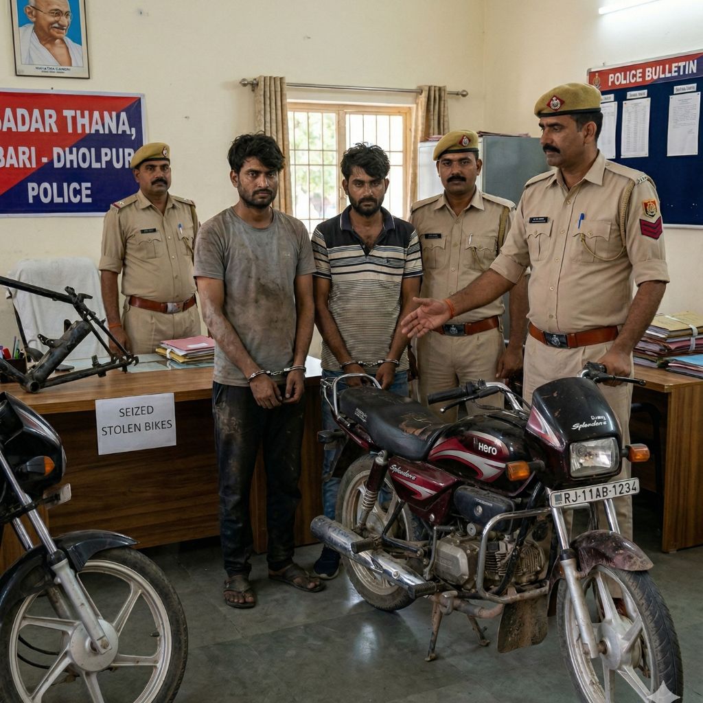 बाड़ी (धौलपुर)। सदर थाना पुलिस ने बाइक चोरी की वारदातों पर अंकुश लगाने के लिए एक शानदार(Sentiment Word) और साहसिक कारवाई को अंजाम दिया है। पुलिस टीम ने कड़ी मशक्कत के बाद दो शातिर बाइक चोरों को गिरफ्तार करने में सफलता हासिल की है। इस कार्रवाई की खास बात यह रही कि पुलिस ने एक आरोपी का पीछा करते हुए महाराष्ट्र की राजधानी मुंबई तक दबिश दी और उसे सलाखों के पीछे पहुँचाया।